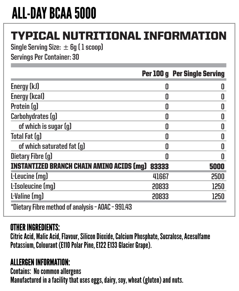 NUTRITECH® ALL DAY BCAA 5000 is a stimulant-free intra-workout and functional amino hydration. The classic ALL DAY BCAA 5000 formula is engineered with 2500mg Leucine, 1250mg Isoleucine and 1250mg Valine to deliver IBCAA hydration to the muscles, prevent muscle breakdown and assist protein synthesis. Designed to speed up post-workout recovery, and when taken as directed, the ALL DAY BCAA 5000 formula delivers 5000mg of Instantized Branched Chain Amino Acids, on the research validated 2:1:1 ratio, per single serving with lightly sweetened and refreshing flavours; guaranteed thirst quenching and easy drinking.