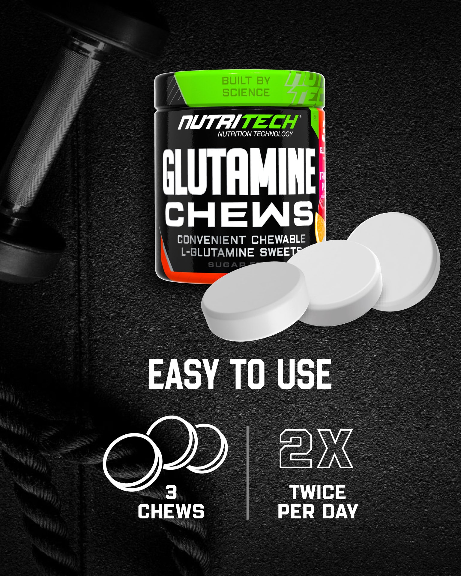 NUTRITECH Glutamine Chews, your on-the-go recovery aid. These convenient chews are packed with 5g of L-Glutamine per 5 chews, providing the recovery fuel you need, wherever you are. Just toss them in your gym bag, leave them in the car, or stash them in your locker for quick and easy access.