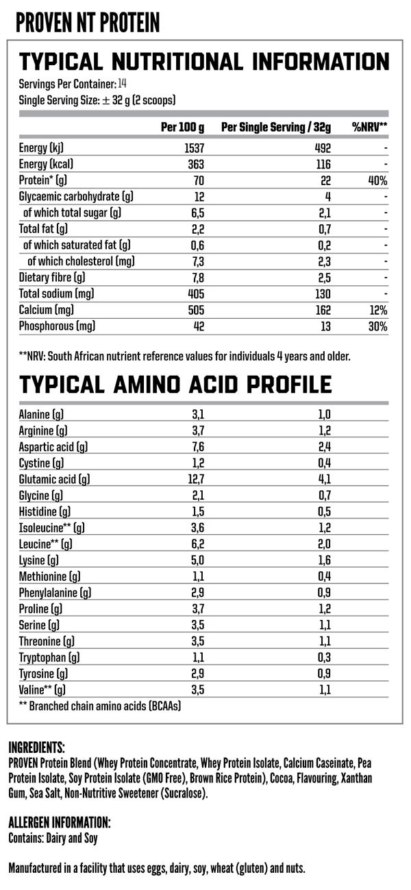 PROVEN NT PROTEIN makes use of a precise blend of fast digesting proteins such as whey protein isolates and concentrates, medium digesting proteins such as pea and rice isolates and the slow digesting protein, calcium caseinate to maximise protein synthesis and ensure muscle protein retention levels remain elevated for longer.